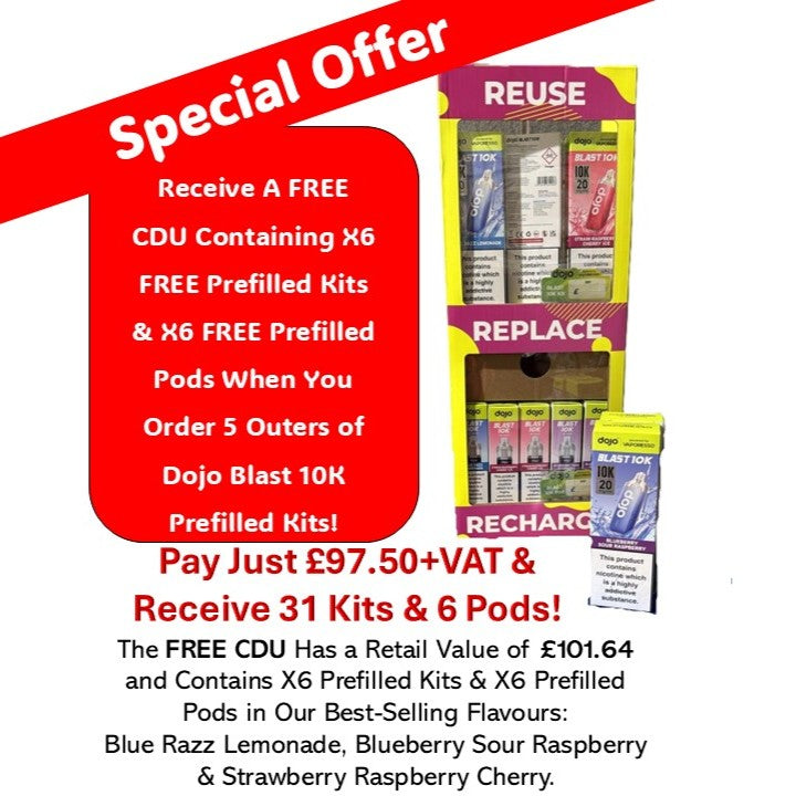 Receive A FREE CDU Containing X6 FREE Prefilled Kits & X6 FREE Prefilled Pods When You Order 5 Outers of Dojo Blast 10K Prefilled Kits!
